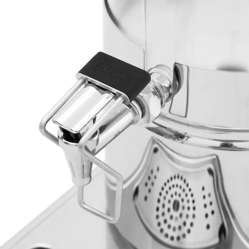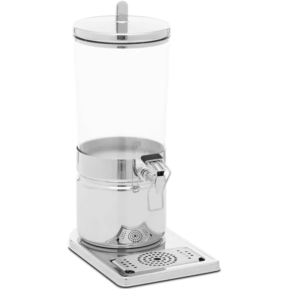 The Royal Catering beverage dispenser is used to serve cold drinks such as water, lemonade, iced tea, milk or fruit juices. It will work in hotel buffets or at events with catering. The capacity of 6 l allows you to prepare a large amount of drink at the same time. The tap allows you to accurately measure the portion of the drink. Practical drainer keeps you clean. The base, lid and tap are made of stainless steel, while the cylindrical container with a diameter of 200 mm is made of plastic. The materials used are scratch-resistant and easy to clean. The cooling cartridges at the top and bottom of the dispenser are impermeable, providing uniform cooling without being diluted by melting ice. The maximum height of the glass under the pouring machine is 140 mm.