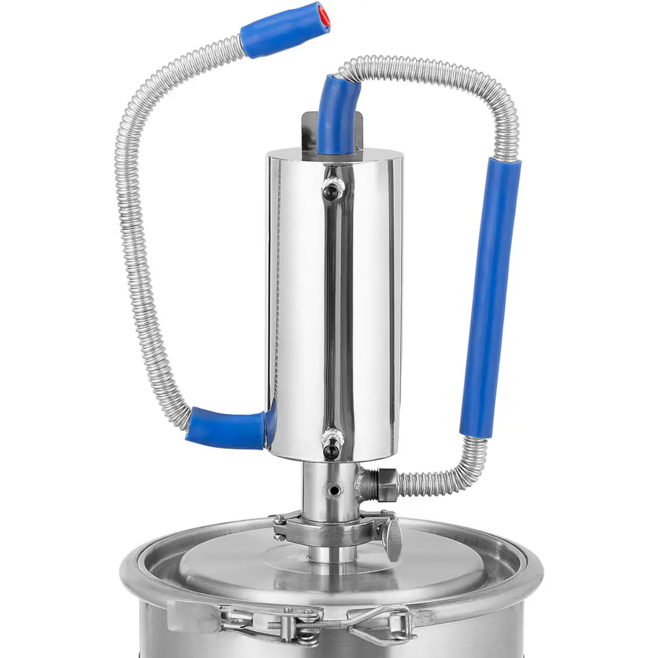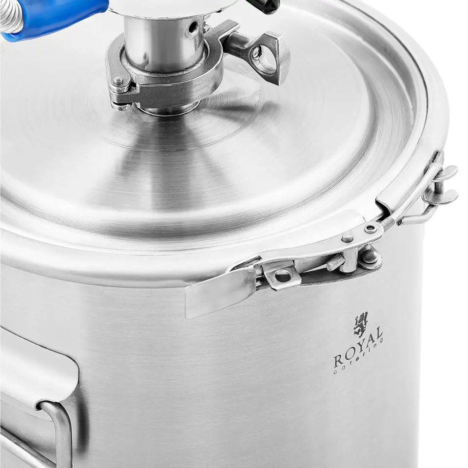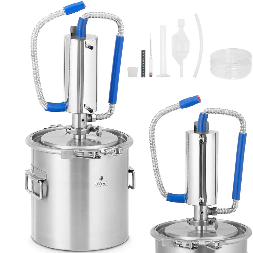 The Royal Catering distiller effectively purifies water from salts, trace elements, microorganisms, lime residues, lead and other impurities. It allows you to produce essential oils and perfumes. The capacity of the distiller is 12 l, the diameter measures 250 mm. Any heat source can be used to heat it, e.g. an electric hob or a gas stove. The device includes all the necessary hoses and containers needed for an efficient distillation process. Individual elements: cylinders, connections, bases can be quickly connected to each other. The cooling hose has a length of 1.5 m, provides ideal results when distilling water, oils or other chemicals. The included alcoholometer allows you to reliably determine the alcohol content of the distilled liquid. The stainless steel used in the product meets the highest hygienic standards, is resistant to corrosion and easy to clean. Folding handles allow safe transport and handling.