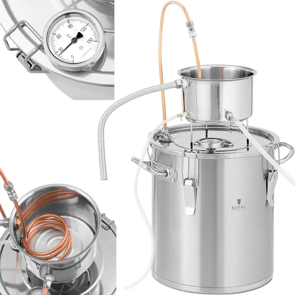 The Royal Catering distiller effectively purifies water from salts, trace elements, microorganisms, lime residues, lead and other impurities. It allows you to produce essential oils as well as perfumes. The capacity of the distiller is 20 l, the diameter measures 290 mm. Any heat source can be used to heat it, e.g. an electric hob or a gas stove. The machine includes all the necessary hoses and containers needed for an efficient distillation process. The individual components: cylinders, connections, bases can be quickly connected to each other. The cooling hose has a length of 1.5 m, providing ideal results when distilling water, oils or other chemicals. The copper spiral is responsible for optimal cooling. The included alcoholometer allows you to reliably determine the alcohol content of the distilled liquid. A clear analog thermometer shows the temperature inside the boiler in the range of 0-150C. The stainless steel used in the product meets the highest hygienic standards, is resistant to corrosion and easy to clean. Comfortable handles enable safe transport and handling.
