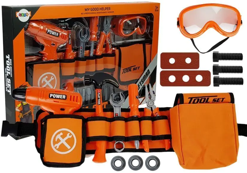The belt has many compartments that will accommodate all the most necessary items, fastened with a buckle. The drill is perfectly profiled for small handles, making it easy to hold and perform various types of work. All elements of the set have been perfectly mapped and complement each other to give full opportunities for the child's development in getting acquainted with all the tools, how to use them and what we will do with them.