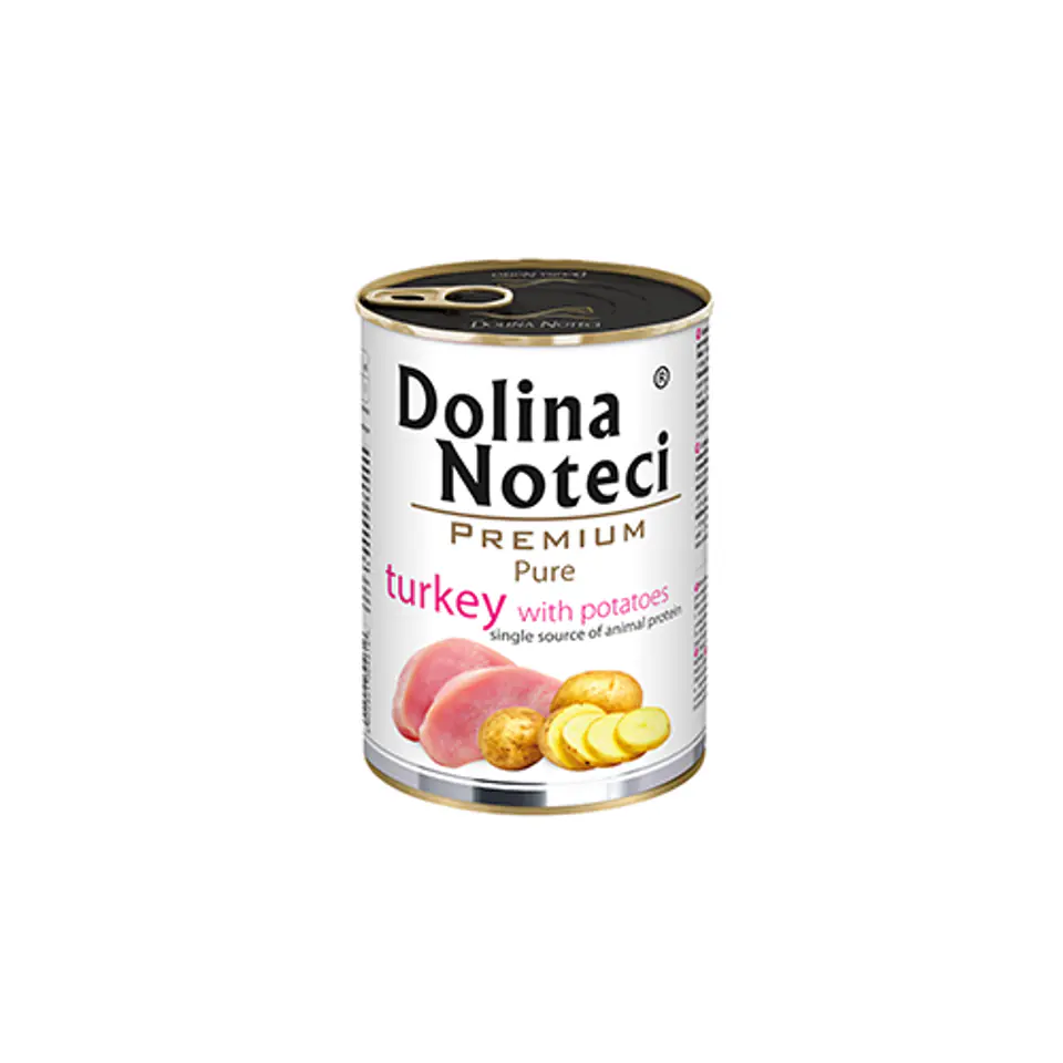 Food allergy is an ailment that the owner of a four-legged dog should not underestimate. It is then necessary to use an appropriate diet that eliminates the component that causes an allergic reaction. Monoprotein wet food Dolina Noteci Premium Pure turkey with potatoes is a product created for dogs with a sensitive digestive system that show symptoms of intolerance to a specific type of protein. Meat and raw materials of animal origin from turkey are characterized by a high content of easily digestible protein rich in exogenous amino acids and fat that is a source of valuable fatty acids, especially from the n-6 family. Thanks to this, the wet food Dolina Noteci Premium Pure turkey with potatoes for allergy-free dogs ensures that the homeostasis of anti-inflammatory processes, important for the proper functioning of the digestive tract, is maintained at the appropriate level. The addition of potatoes increases the digestibility of food, and also improves its palatability.