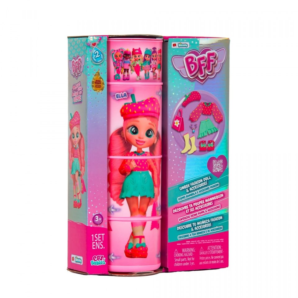 With her stylish pink hair, glass eyes and 6 moving parts, Ella is ready for any adventure! She wears a fashionable outfit which is complemented by an adorable strawberry shaped hat! She's wearing a top with a strawberry motif and buff sleeves, as well as a delightful green skirt and strawberry shoes! Don't forget to add a pink daisy print handbag and a BFF necklace too!