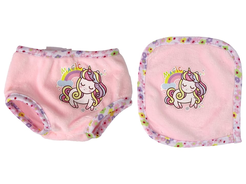 The doll is dressed in beautiful pink pajamas with flowers and a beautiful unicorn in the middle There is a cap on the baby's head. The set includes a pink soother and drinking bottle as well as a bib and unicorn panties. The whole fits together perfectly and looks simply charming. The doll has movable arms and legs and a head. It can be placed sitting or lying down. The clothing is removable, which will allow you to change your wardrobe.