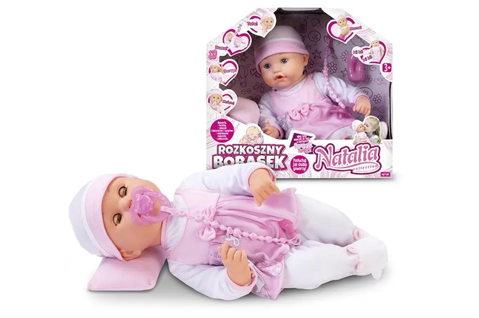 The Natalia Collection's delightful baby bean is an interactive toy that responds to accessories, touch and movement. It makes the sounds of eating, crying, laughing, sleeping, as well as saying the phrases mama, papa and sending kisses. The doll's functions are activated by natural gestures and movements that are performed with a real baby, such as rocking, patting on the back or tossing.