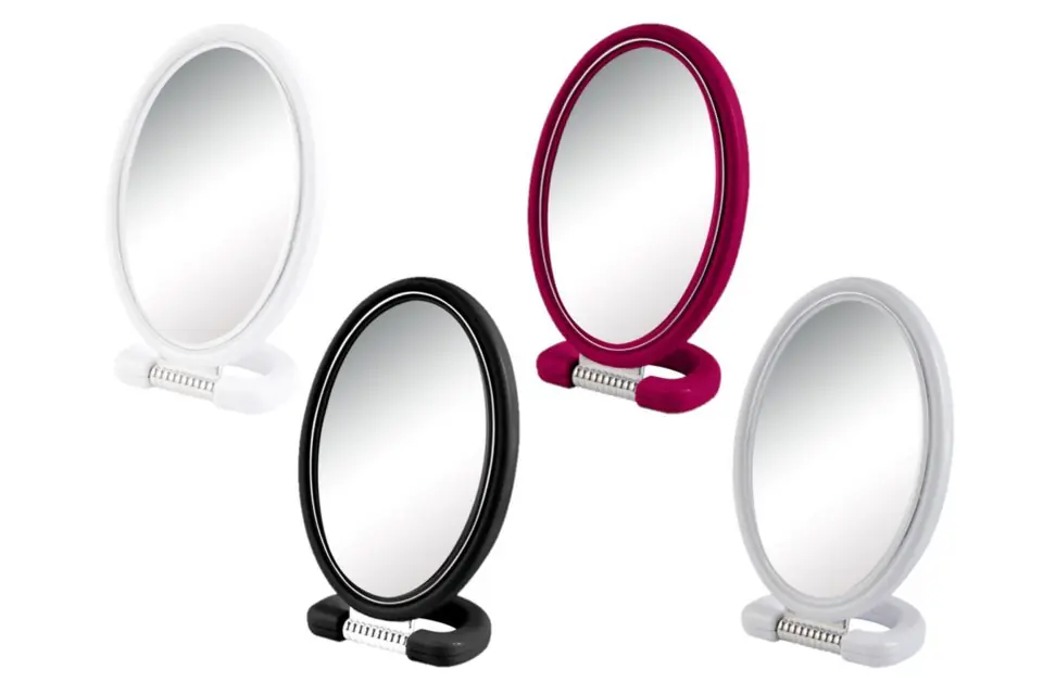 The oval cosmetic mirror has a real mirror on one side, and a magnifying mirror on the other.