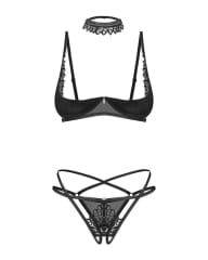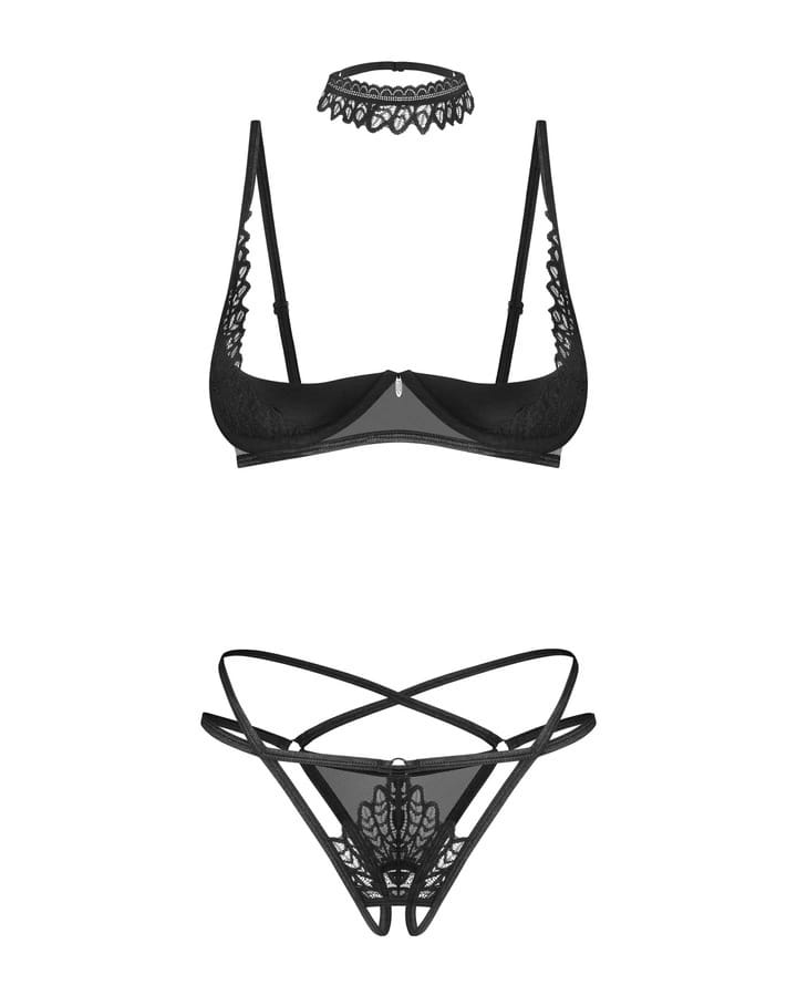 Donarella to komplet, który przyciąga uwagę i uwodzi od pierwszego spojrzenia. Czarne koronki, otwarte miseczki i stringi w odważnej odsłonie tworzą kompozycję idealną na zmysłowy wieczór. Półbiustonosz z fiszbinami delikatnie unosi piersi, a kilkustopniowe zapięcie i regulowane ramiączka pozwalają na idealne dopasowanie. Zestaw uzupełnia choker z możliwością regulacji, ozdobiony połyskującą zawieszką. Całość została wykonana z miękkiego, przyjemnego w dotyku materiału.