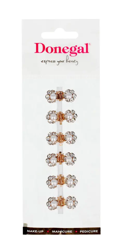 Decorative mini hair clips in gold color with rhinestone flowers and pearl.