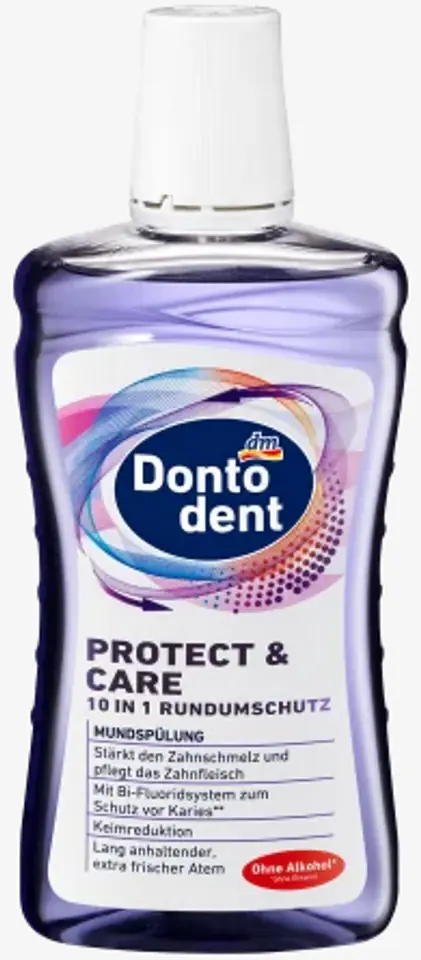 Alcohol-free (ethanol-free) mouthwash Dontodent Protect&Care 10 in 1, a comprehensive protection, has been specially developed for comprehensive hygiene of the entire oral cavity. Thanks to the active formula with 10x all-round protection, it provides a well-groomed, exceptionally fresh feeling in the mouth and cleans the mouth even in hard-to-reach places where the brush does not reach.