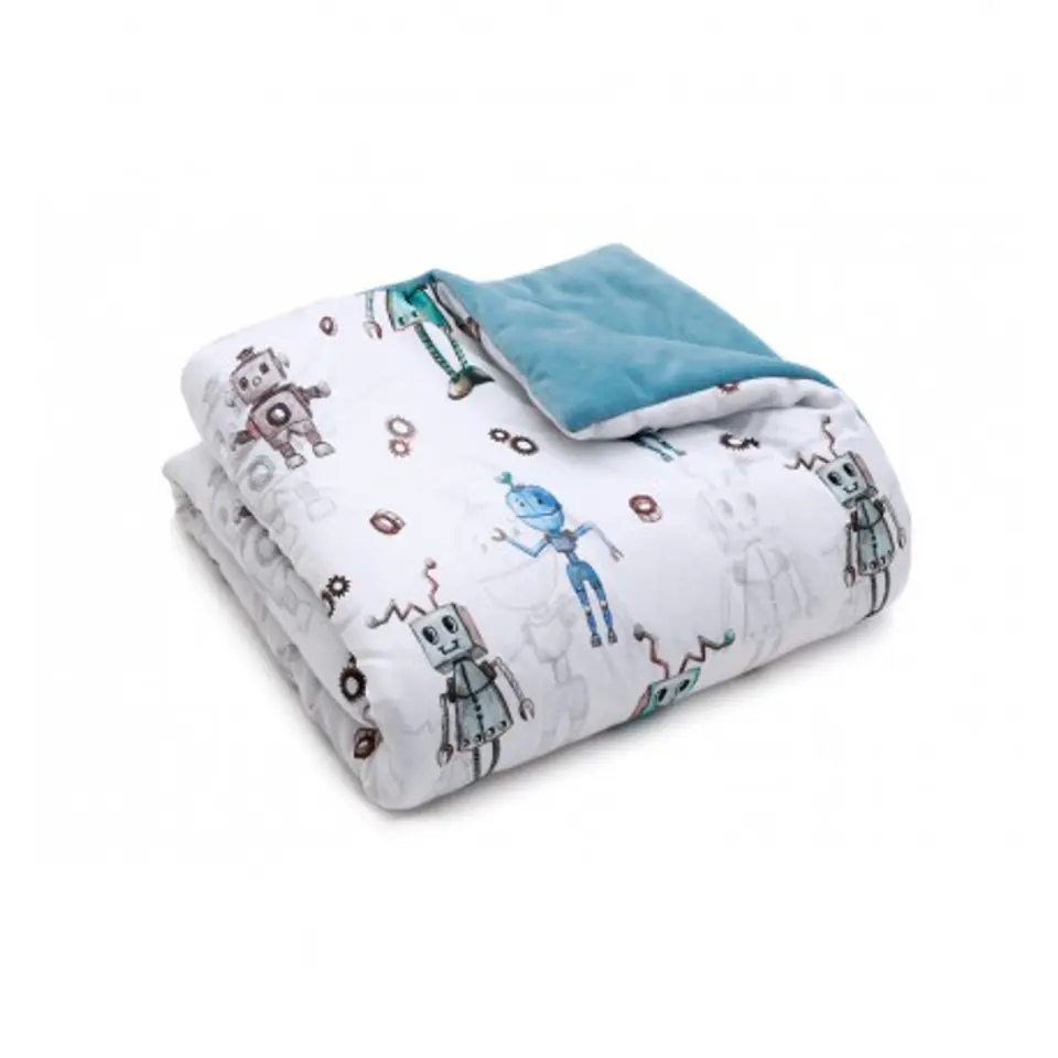 Double-sided Bamboo/Velvet Blanket - ROBOTS Beautiful, soft, double-sided blanket for children, which will also work as a quilt. On the one hand, it is the highest quality CV bamboo fabric and the other side is an elegant Velvet. Inside, the blanket is filled with anti-allergic silicone non-woven fabric that gives it extraordinary lightness, providing pleasant warmth. The universal size makes it ideal for a baby as well as for an average – it is suitable for a cot, stroller and as a play mat throughout the year. The blanket can be completed with a pillow, the same pattern creating a unique arrangement of the stroller and the original pattern will ensure the uniqueness of the toddler's room décor. The blanket is an unforgettable gift for baby showers, birthdays and all other occasions. The product is hand-sewn using the best quality materials, finished in accordance with the GOTS Certificate. All PULP products are Oeko-Tex Standard 100 certified and safe for the child. Washing without fear of losing quality: - wash at 40 °, gentle program, light spinning, - iron only bamboo fabric - do not use bleach, - do not tumble dry. 11110-36