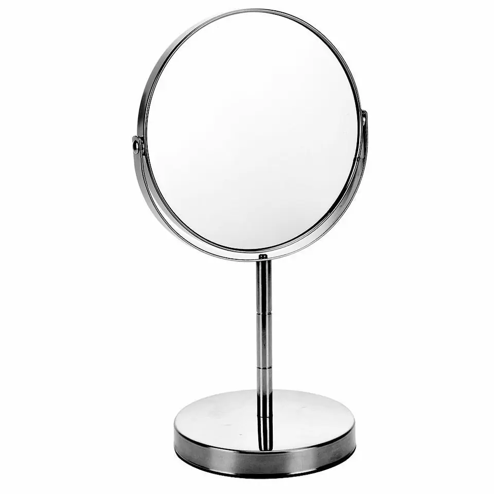 Stylish, double-sided mirror made of stainless steel. Classic, round shape and leg with a wide, stable base. It will be an excellent addition to the English dressing table.