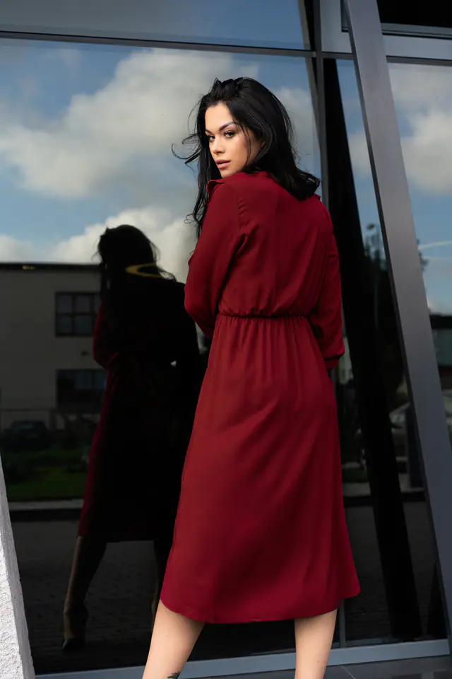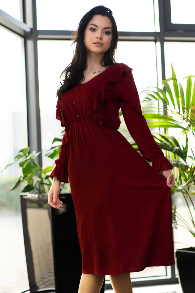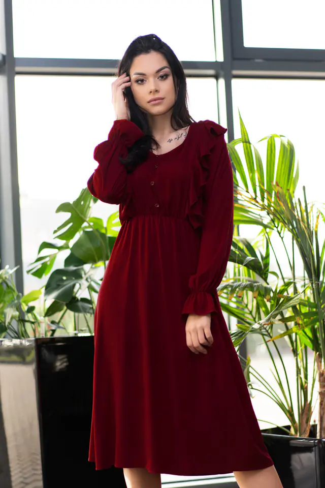 Cherry dress with midi cut, perfect for holidays and not only. Cut with stitching at the waist, on the elastic band, with decorative buttons and delicate flounces on the neckline, romantic and feminine. Composition: 95% viscose, 5% elastane.