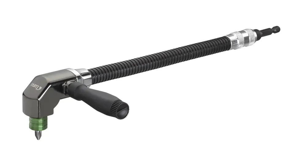 Angle attachment for drill, with flexible shaft. It allows screwing screws and drilling work in places with difficult access. Equipped with an additional bracket that can be mounted on the right or left side. With 1/4" shank and bevel gear transmission up to 20 Nm.