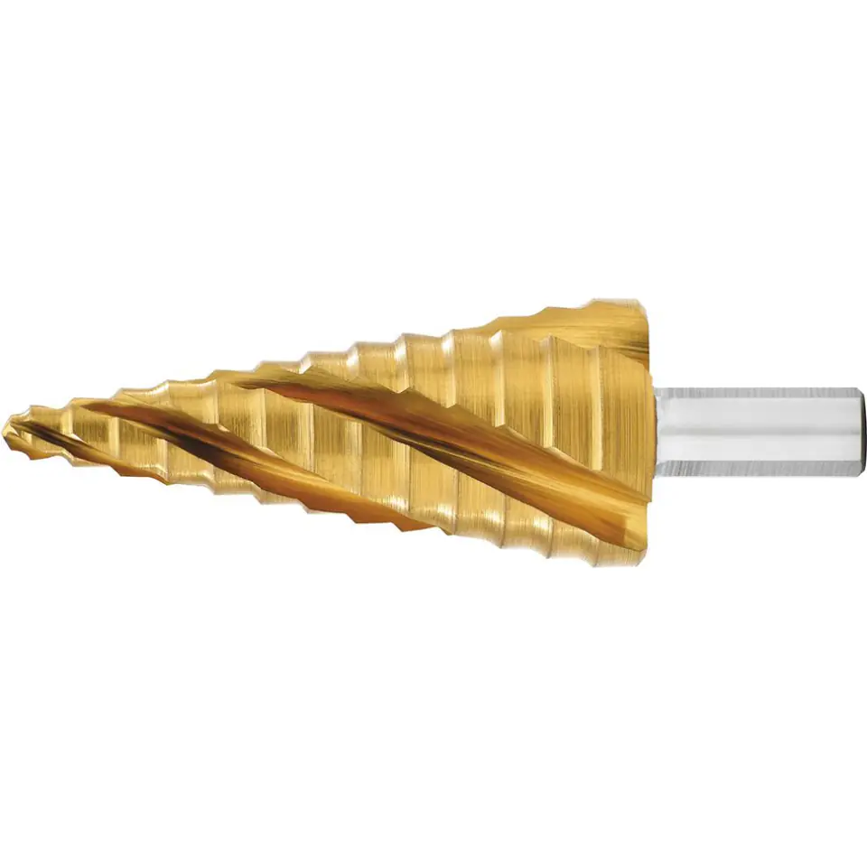 Design: innovative step drill with 4 cutting edges, INNOVATIVE QUADRUPLE SPIRAL GROOVE, NEW TURBO TIP vertex greatly simplifies centering and drilling. The 3-plane shank prevents the tool from slipping in the chuck. With laser marking of bore diameter and rotational speed. The bore diameter can also be read on a rotating tool.