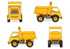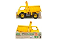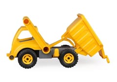 Tipper truck manufactured in an eco-friendly way using recycled materials and wood admixtures. Features movable parts and protection against unwanted tipping. Hinged cab.