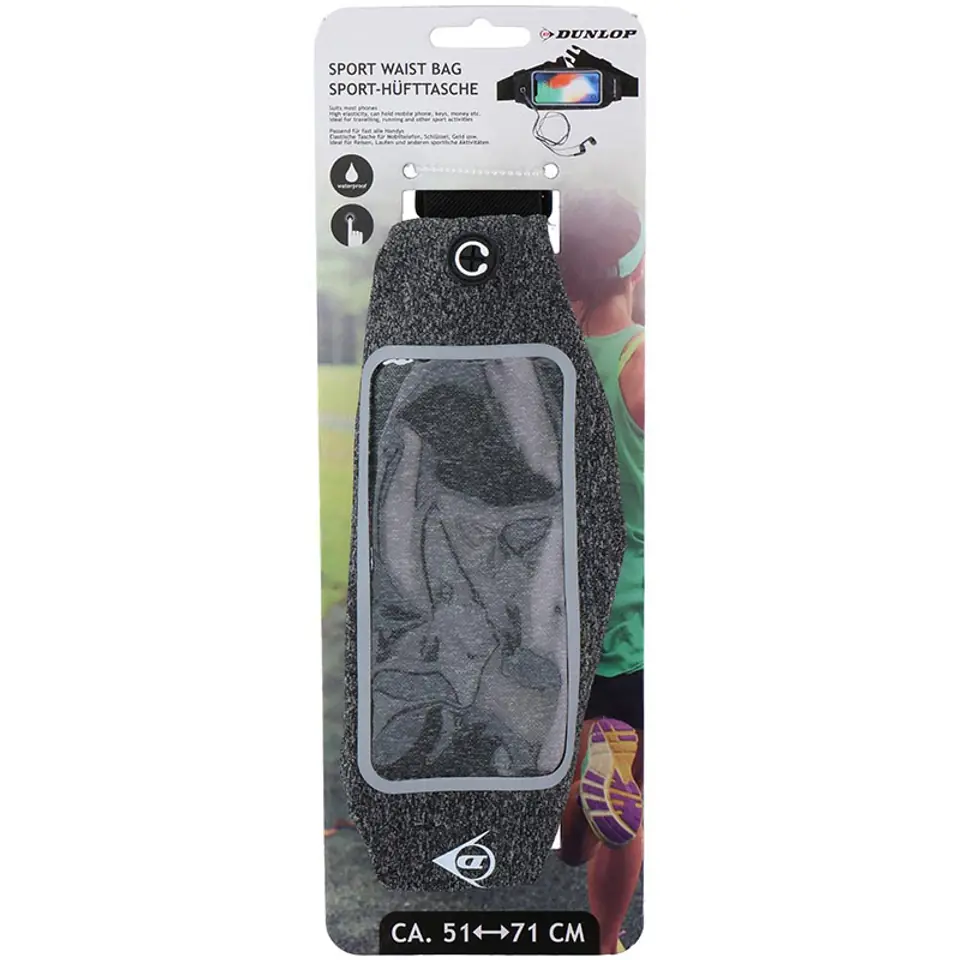 Dunlop waterproof sports kidney in grey for your phone and other small items. Dimensions: 20 x 9 cm, length of the adjustable strap 51-71 cm.