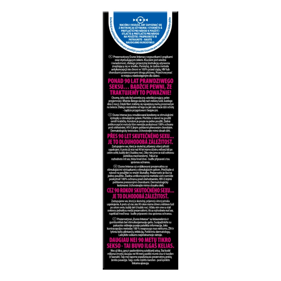 Durex Intense are the first condoms* that improve the sexual experience of both partners, making it easier for her to reach orgasm and giving him greater satisfaction. Transparent, moistened latex condoms, ribbed with protrusions, covered with Desirex stimulating gel. Benefits for both partners! For her: Strations and protrusions as well as the stimulating gel give a variety of sensations from warming up, through cooling to tingling, which increases the intensity of orgasms. For him: The satisfaction of giving pleasure to your partner, in addition, the shape of the Easy-On provides greater comfort of putting on and a better fit of the condom. Thanks to Durex Intense, every man can provide his partner with amazing orgasms!
