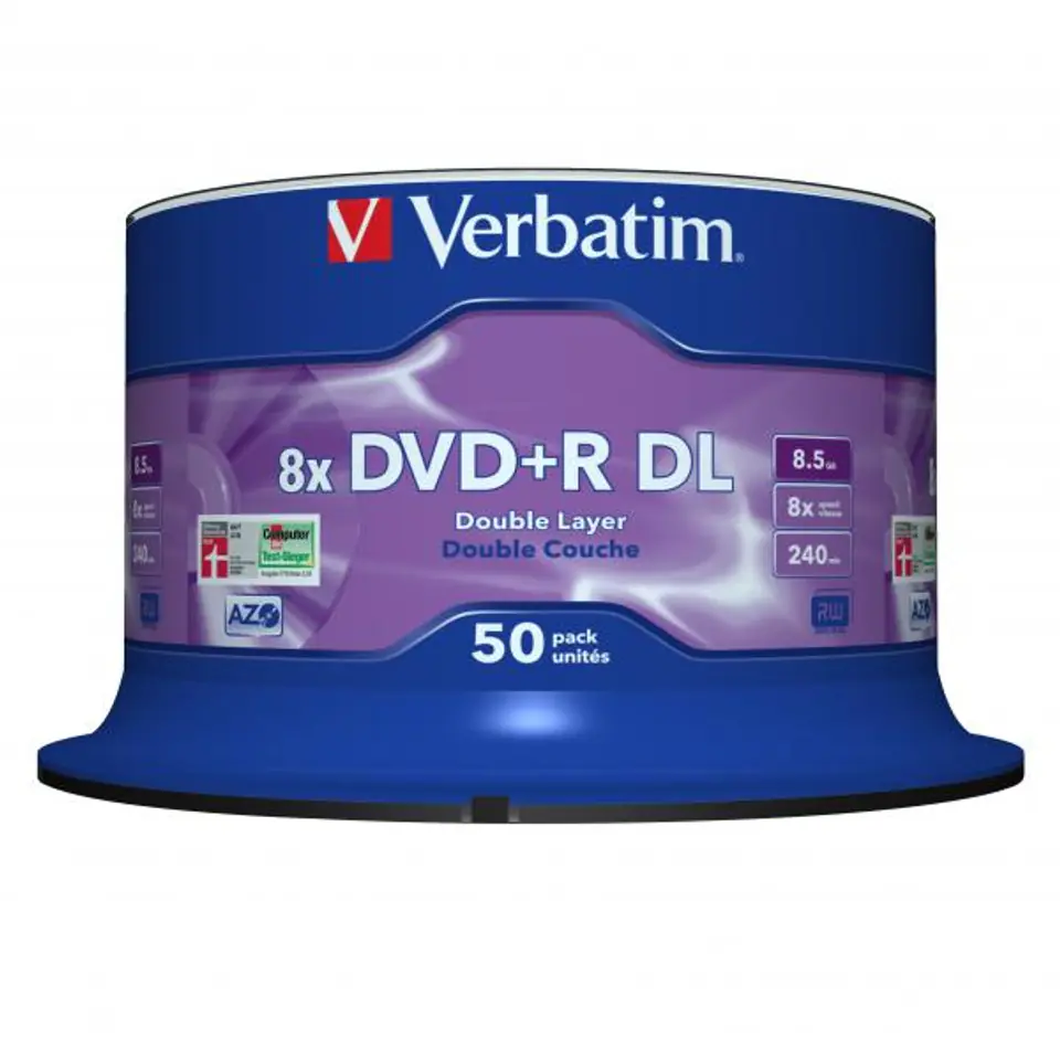 Verbatim DVD+R Double Layer 8x Matt Silver 50pk Spindle drives allow you to save computer data, videos, photos and music. Discs are characterized by high recording stability and a fairly long shelf life. Verbatim discs can save data at speeds ranging from 1-8x. The recording length is 240 minutes, which will allow for convenient data storage. In a convenient cake packaging you will find 50 discs.