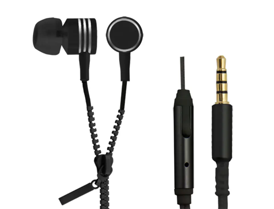 Wired, metal, intrusive earphones with microphone. The headphone cable is divided into two parts. The bottom of the cable is covered with material that protects the cable from damage. The upper part is made in the form of a zipper which prevents tangling of the cable and allows easy adjustment of the cable length to the requirements of the user. In addition to the microphone, a button for receiving / ending incoming calls and pausing / resuming music playback are built in.