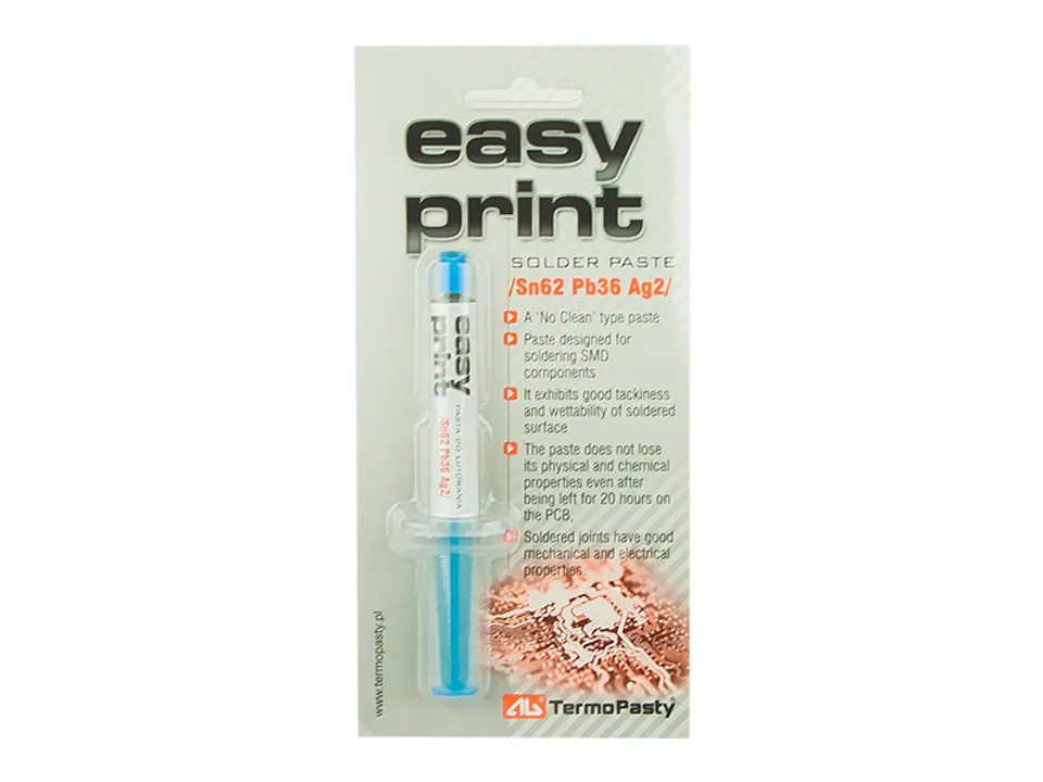 Paste designed for soldering SMD elements in production processes that do not take into account the washing phases. Based on No Clean flux, does not require washing, the residues of which do not cause corrosion foci. The product works with all lead-free alloys, it is characterized by good adhesion and wettability of the soldered surface. It does not lose its physicochemical properties even after 20 hours of leaving it on the PCB. This time depends on the conditions prevailing in the room: humidity and temperature.