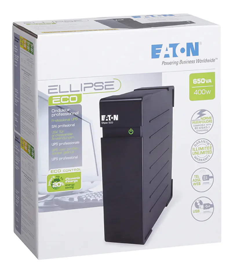 The Eaton Ellipse ECO is a slim-line power protection with built-in high performance surge-protection device (compliant with IEC 61643-1 standard). With an efficient electrical design and the EcoControl function (USB models) the Eaton Ellipse ECO helps you make energy savings of up to 25 per cent compared to previous-generation UPSs.