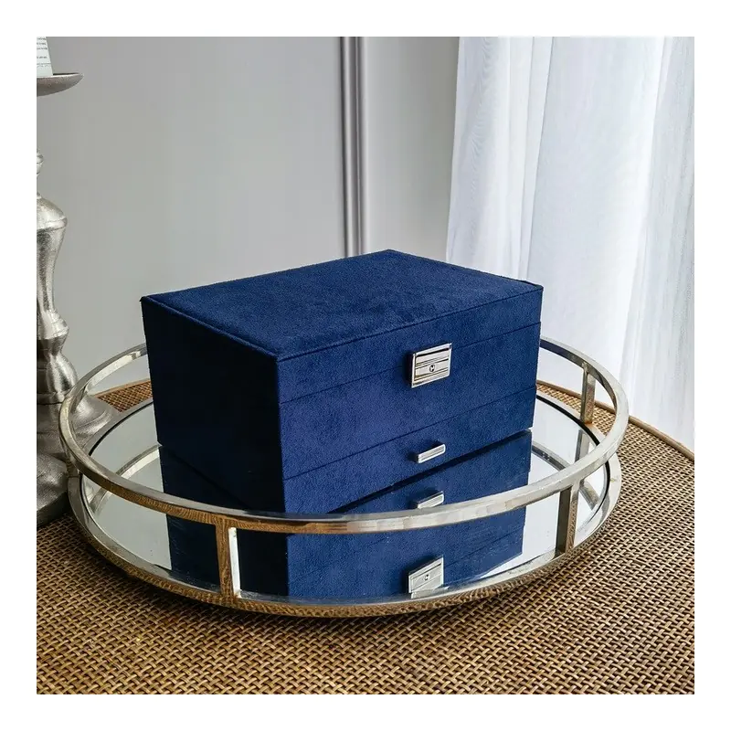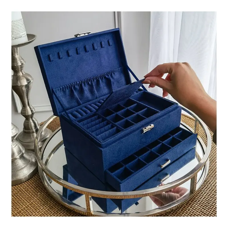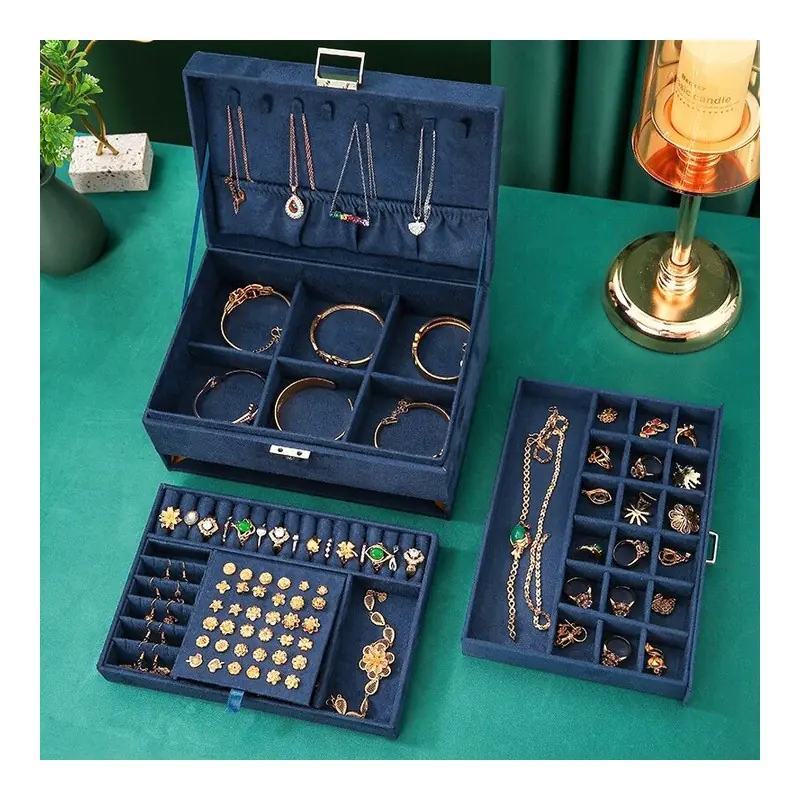 Very functional - allows you to conveniently store a large amount of jewelry in one place in an orderly way. It has a solid metal lock. Covered with an elegant material imitating suede. The center is filled with soft velour material.
