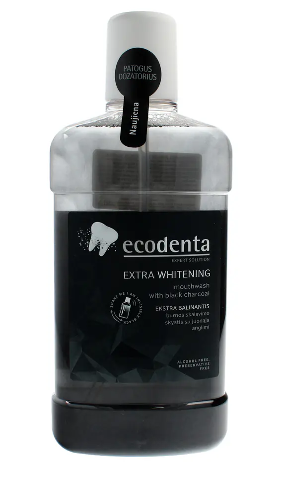 Ecodenta black mouthwash was created for people who like innovative and unconventional everyday solutions. The mouthwash contains oak charcoal and salts to protect against plaque. Peppermint oil provides long-lasting freshness, and sodium fluoride protects teeth from caries. For best effect, it is recommended to use with black whitening toothpaste with black carbon and Teviago.