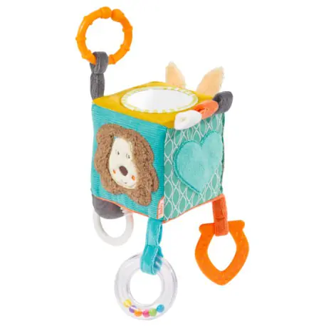Educational cube from the collection: Funny Friends The toy offers everything that makes the hearts of little explorers beat faster. A variety of colors and a fabric blend of soft velor, jersey and flannel, invite you to touch and stroke. The forms and animals used, a safety mirror and a hidden pocket particularly stimulate tactile and visual sensations. An educational cube is always something new. It encourages grasping and triggers the desire to play. The bell inside happily rings. In the small, safety mirror you can look at yourself. Thanks to the practical fixing ring, the cube is securely attached to the child seat, stroller, playpen and cot. So it quickly becomes a faithful companion at home and on the road, always ensuring a good mood! The cube is made of many, pleasant to the touch, materials. Develops logical thinking, concentration, small motor skills. It arouses curiosity and stimulates the perception of the child. The teether relieves pain during teething. A rattle, a bell and a safety mirror, rustling paper and a pipe, trigger the desire to play. Easy to assemble. Washable. Size : 10 x 10 cm. All toys of the German brand FEHN are safe for children from 0 years. They are made of the best quality materials. comply with EN71, CE standards, tested in the institutes "Stiftung Warentest"" or "Ökotest". 66029