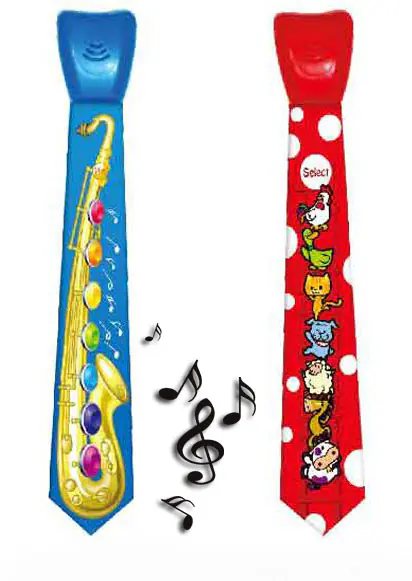 The tie comes in two versions: emitting saxophone sounds and animals.