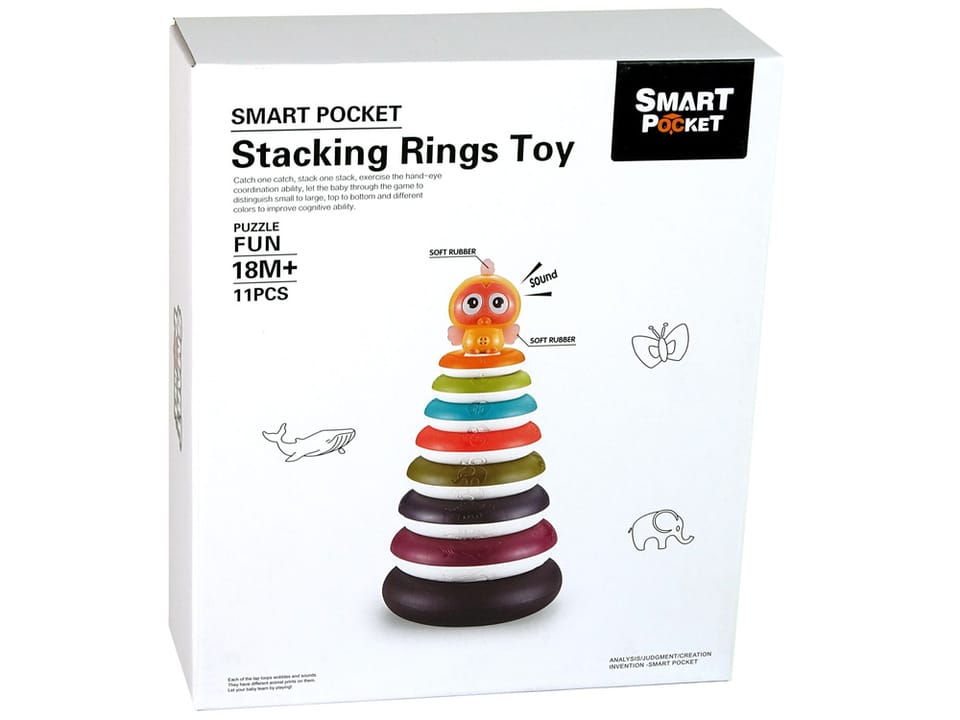 The set consists of several types of rings of different sizes. One possibility is to arrange rings according to the child's imagination. Placed at the top of the pyramid, the yellow duck additionally makes the whole game more attractive by rattling. Its wings are made of soft rubber, which can be used as a teether. Colorful colors with animals will help in the development of your child and learning about the world around him. On the pyramid there are also images of animals corresponding to the corresponding circles. A toddler when arranging the tower may suggest pictures.