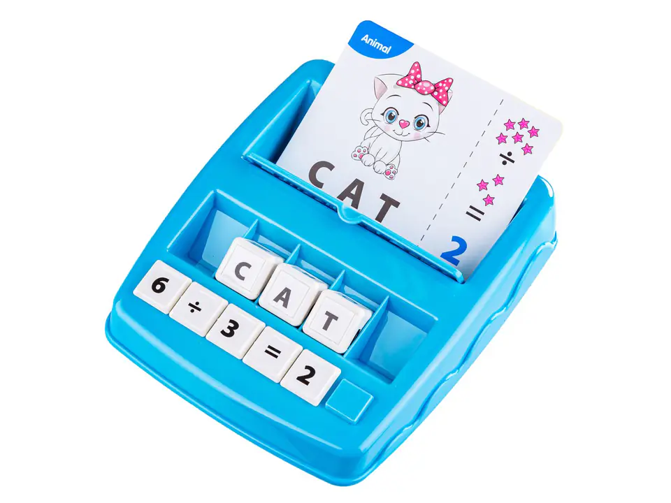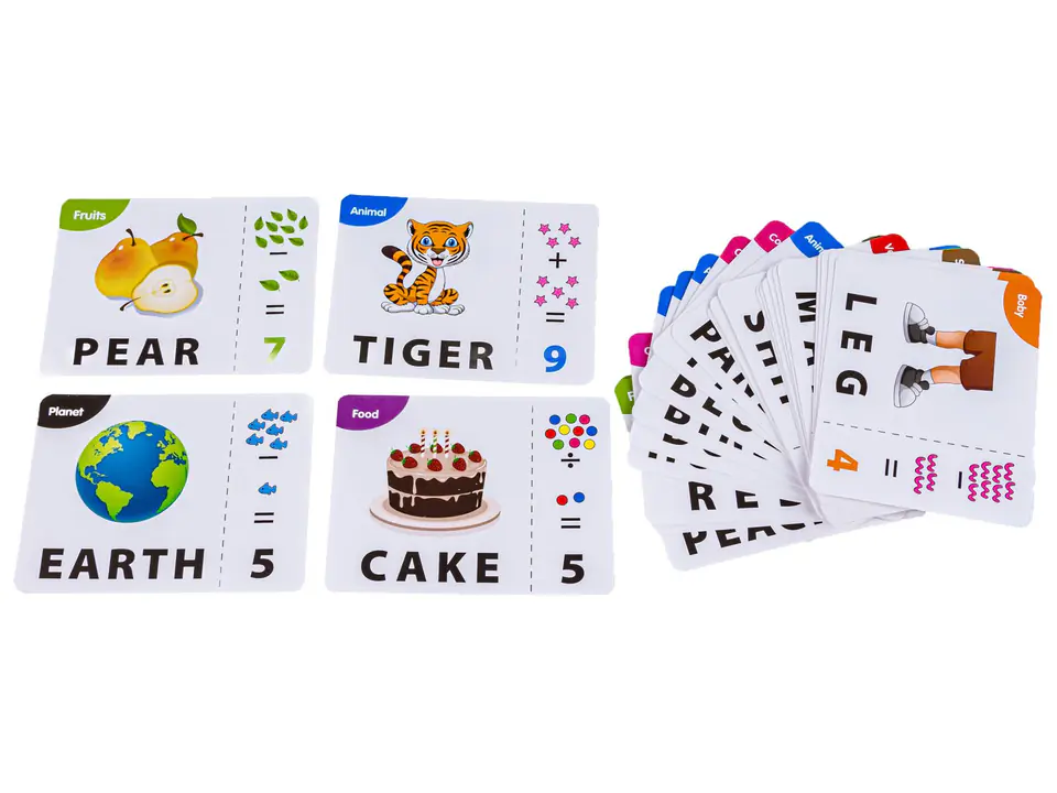 The toy stand has a special flap, thanks to which you can cover the word on a given card and solve a mathematical equation. Check your memory and fill in the letters and numbers and then discover the flap and compare whether you remembered and calculated the :)
