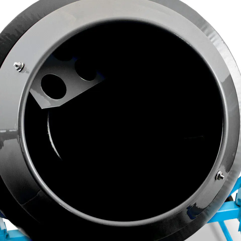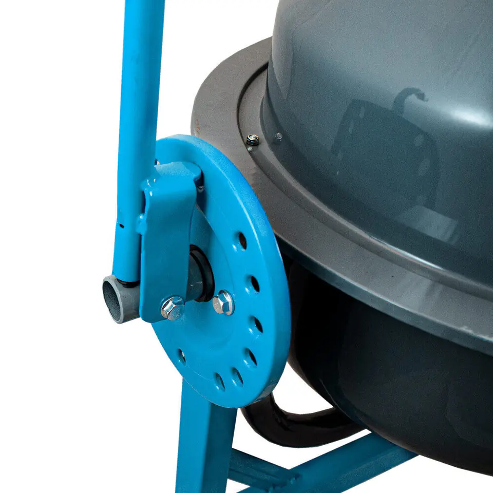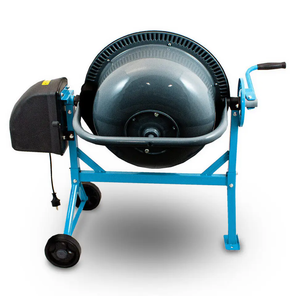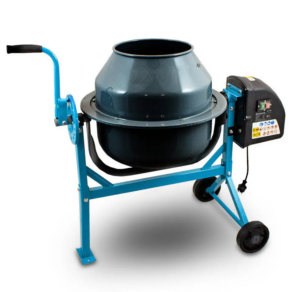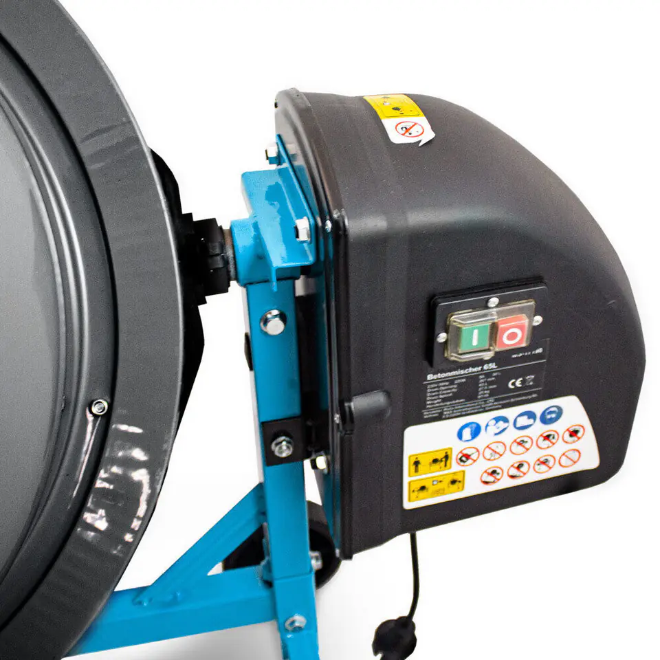 The concrete mixer has a conical drum shape, which makes emptying of concrete, mortar is easy. The angle of inclination of the concrete mixer can be freely adjusted using the swingarm. In addition, our product has two wheels that ensure the mobility of the machine and the possibility of its transport and maneuvering. TECHNICAL DATA: - Motor power: 220 W - Drum capacity: 65 l - Drum speed: 27.5 rpm - Drum opening: 267 mm - Size (L / W / H): 100 x 55 x 93.5 cm - Material: steel - Weight: 25 kg