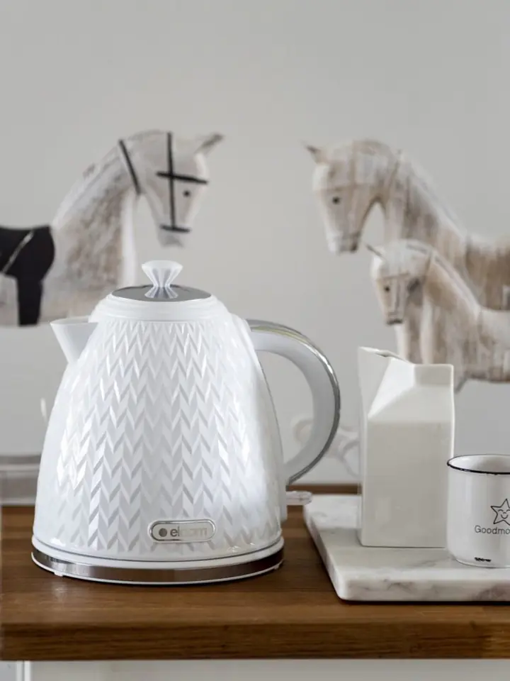 The C265B NELA cordless kettle from the "STAR COLLECTION" series with a power of 2000W is an effective design and reliable operation. It was made of high-quality OTTER components and will boil 0.5 to 1.7 L of water in no time. It has a comfortable handle, a swivel base with space for winding up excess cord, a water level indicator and a mesh filter that stops limescale particles. You can fill it directly through the spout or after opening the lid. It also has a triple safety system, and when it is working, the indicator lamp (located in the switch) lights up. After boiling water, it turns off automatically, but you can also turn it off at any time using the switch.