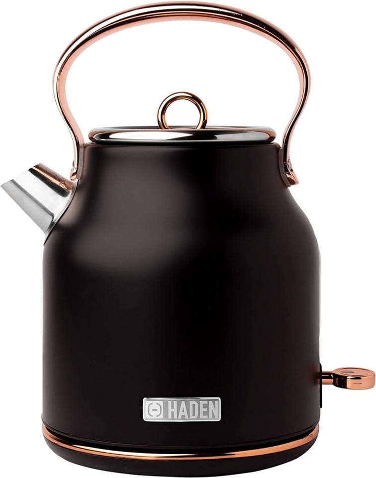 With a traditional design and shape, this beautiful Black & Copper kettle features a 1.7-Liter (7-cup) capacity, ergonomic grip handle, water level gauge, light indicator during boiling, and a spare filter. Perfect for a great-tasting cup of tea or for heating water for pour-over coffee or instant coffee. The cordless design makes it easy to move around your kitchen. The 360-degree base stays cool and allows you to remove and place the kettle on it easily. The boil-dry protection safety feature ensures that the kettle will not turn on if no water is inside.