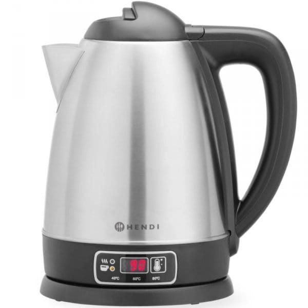 The Hendi cordless kettle allows you to prepare drinks with the indicated brewing conditions, e.g. green tea, white tea, yerba mate, etc. Temperature control and maintenance can be set to 40C, 60C, 80C, 100C. The casing and heater of the kettle are made of stainless steel AISI 304 and the handle and lid are made of polypropylene. The heater is placed under the bottom, which protects it from scaling. The kettle has an intuitive control panel with a display and a thermostat indicator light. Inside there is a maximum water level indicator. The kettle automatically turns off when the water boils. It has double protection against turning on an empty kettle. It is intended only for boiling water - boiling other liquids can damage the kettle.