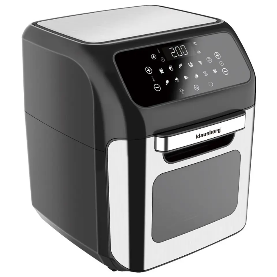 Electric oven fryer for fat-free roasting meats, fish, vegetables, cakes. Oven equipped with a rotisserie function with a rotating chicken basket and skewers. The hot air circulation system ensures uniform baking of food without the risk of burning.