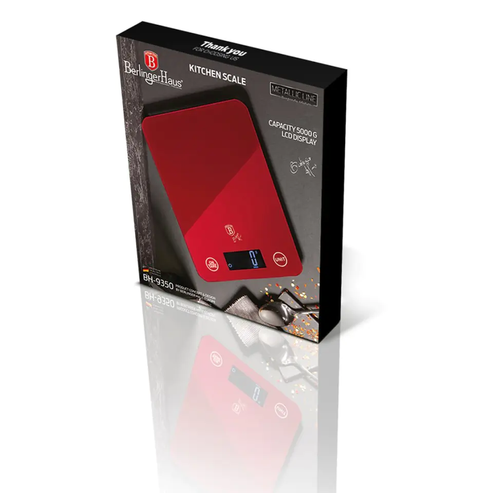 Super flat kitchen scale BERLINGER HAUS. Practical and aesthetic in the colors of the Burgundy Line, made of tempered glass. The sensitivity of the weight is 1g, and the maximum weighted weight is 5kg. The indications are displayed on a large liquid crystal LCD display. It has a very convenient automatic reset function and a TARY function. This means that the ingredients can be put in a bowl and weighed little by little without removing the previous ones that are there. This model is aesthetically pleasing in high quality materials. The scale can be used with or without any vessel. The color scheme is matched to the Burgundy Collection line of dishes