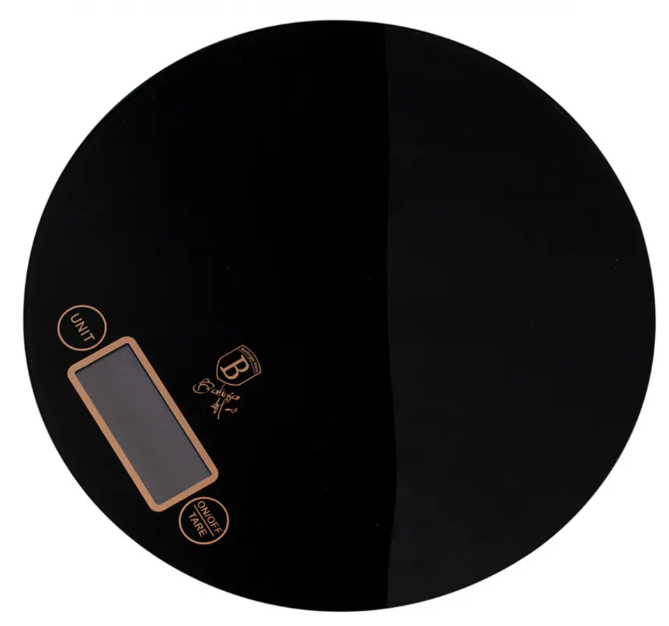 Super flat kitchen scale BERLINGER HAUS. Practical and aesthetic in the colors of the Black Rose line, made of tempered glass. The sensitivity of the weight is 1g, and the maximum weighted weight is 5kg. The indications are displayed on a large liquid crystal LCD display. It has a very convenient automatic reset function and a TARY function. This means that the ingredients can be put in a bowl and weighed little by little without removing the previous ones that are there. This model is aesthetically pleasing in high quality materials. The scale can be used with or without any vessel. The color scheme is matched to the Black Rose line of dishes.