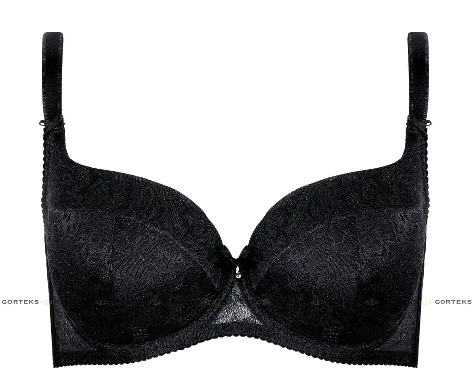 Elegancki usztywniany biustonosz nadaje piersiom naturalny, zaokrąglony kształt. Miseczki ozdobiono połyskliwą koronkową dzianiną, natomiast plecy wykonano w całości z elastycznego tiulu. Atłasowa kokardka z kryształkiem umieszczona między miseczkami dodaje biustonoszowi uroku.