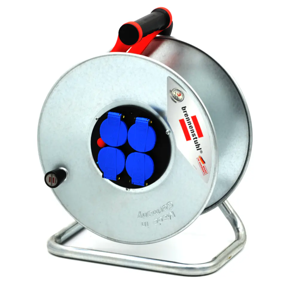 The empty drum for the extension cord is characterized primarily by a galvanized steel support frame. Equipped with 4 sockets and a thermal switch against overload and overheating. Note when connecting the cable, read the instructions for which extension cords the thermal switch is adapted. Both 40 and 50 m long cables can be connected to the drum. Stable construction and innovative solutions are the hallmarks of Brennenstuhl products.