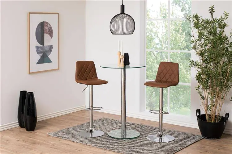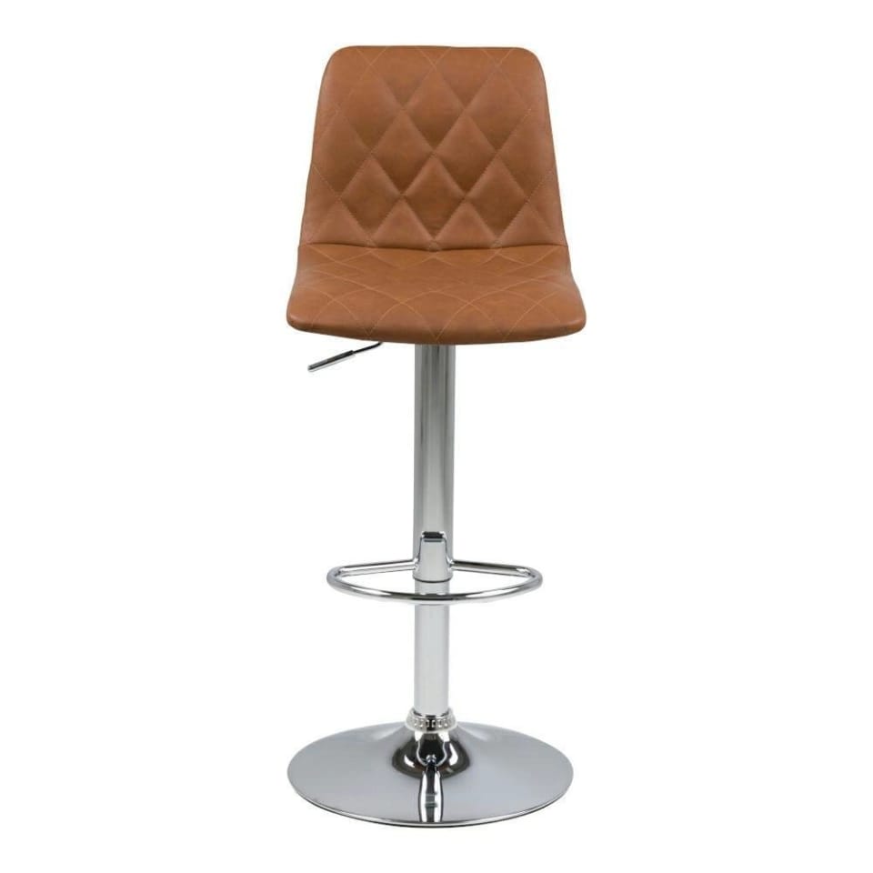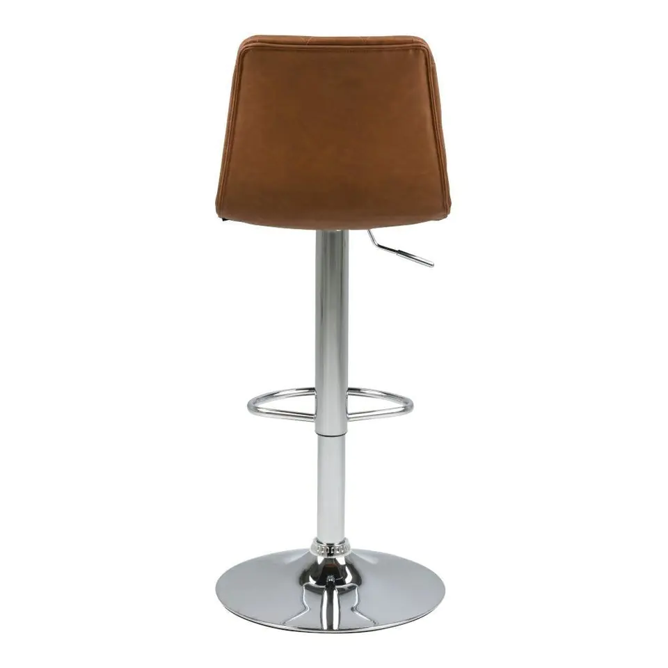 The presented model was created as a result of a combination of a chrome-plated steel leg and an upholstered leather-like seat in light brown. The Emu bar stool is height adjustable, so you can match it with other furniture. The convenience of its use is provided not only by a soft seat, but also by a mounted footrest.