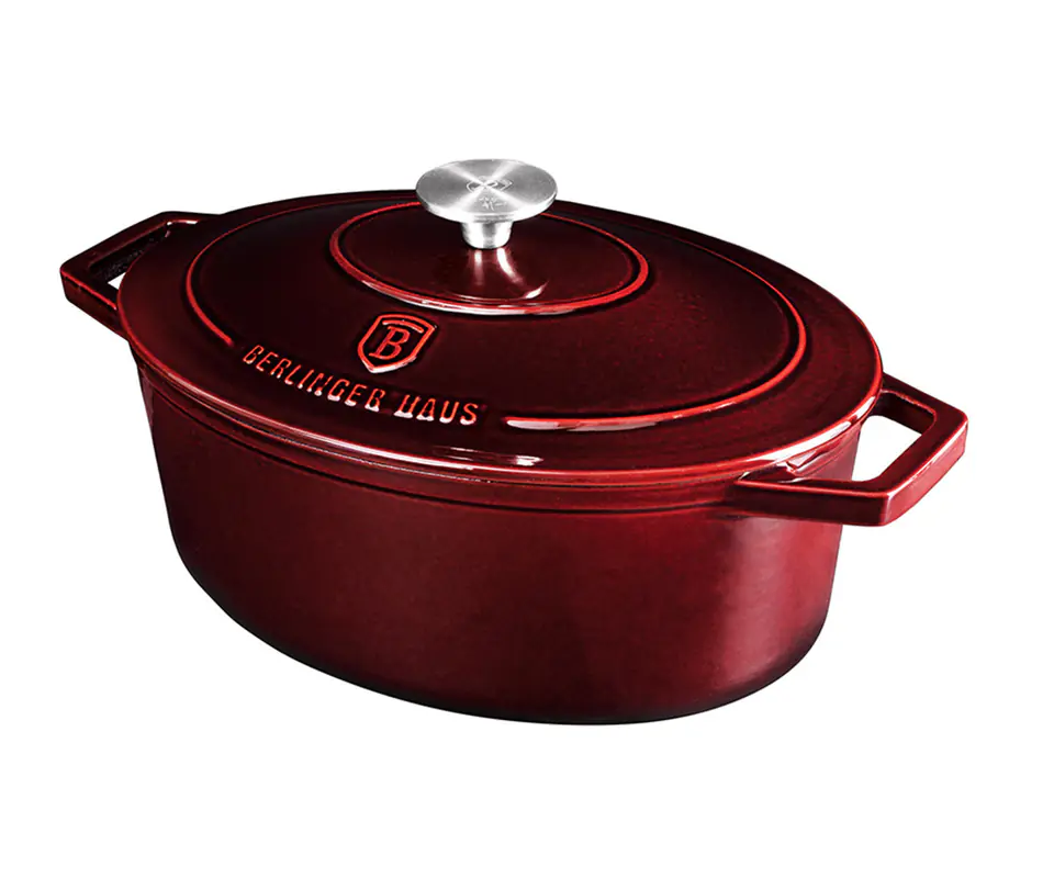 Cast iron pan 32cm with a capacity of 5.56l with a lid. On the outside covered with enamel of red color. Burgundy Strong Mold line of dishes.