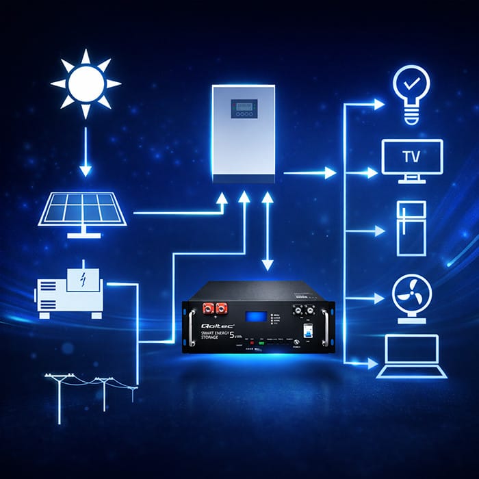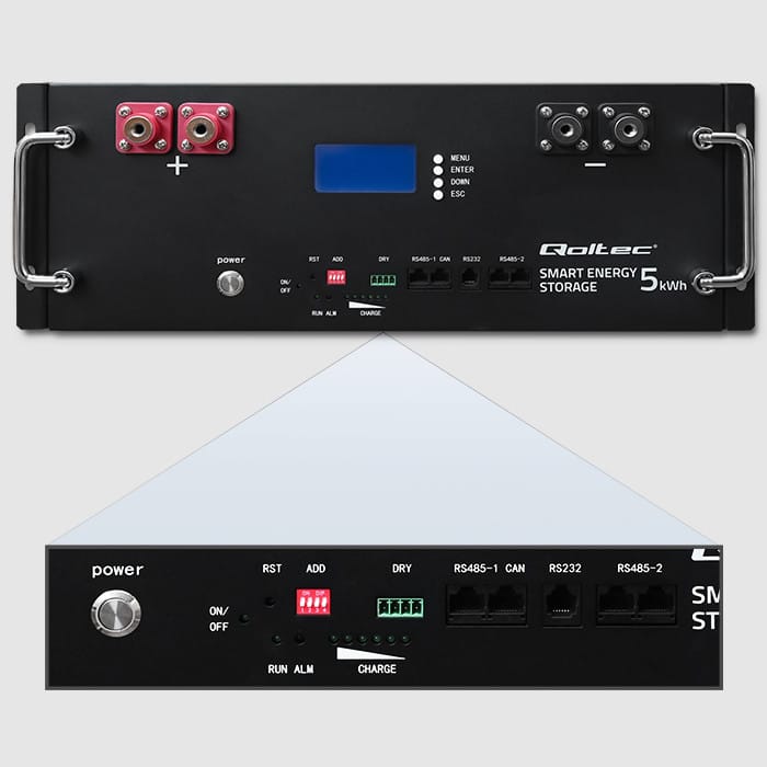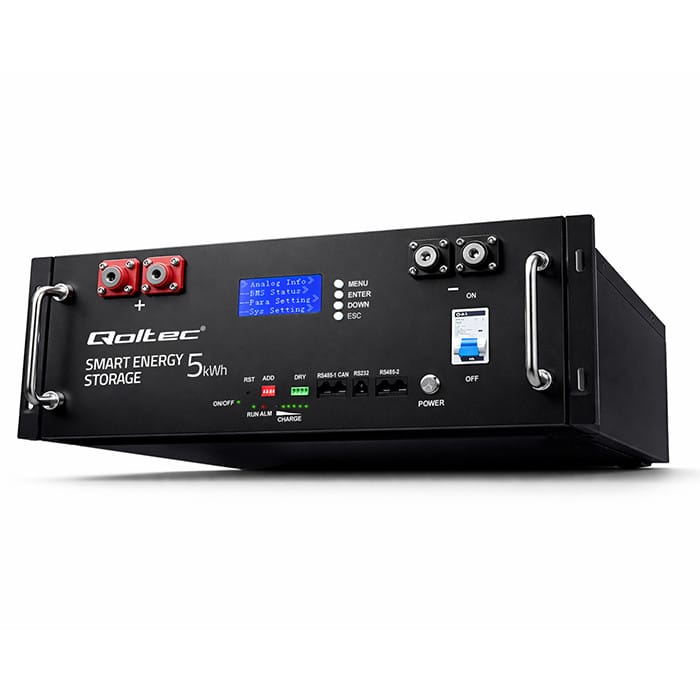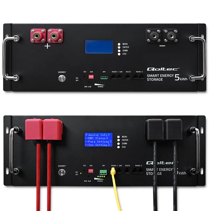 Store up energy and use it whenever you want!Qoltec energy storage will significantly increase the functionality of your photovoltaic installation and provide a stable and environmentally friendly power supply. It can efficiently store surplus energy acquired during the day that we are unable to consume at any given time, until it is fully charged for use at a later time when current production ceases or is below demand, e.g. during power cuts. The stored energy is available at all times when the storage is discharged, electricity is drawn from the grid. Surplus energy can also be sent to the grid.Sustainable Energy in One StorageMain functions of Qoltec energy storage: You can make the most of the energy you produce and use it at a later time, such as on cloudy days or at night, You gain energy independence and security in case of grid failure, the storage will also work well in a place where there is no access to the grid, You significantly reduce the effects of overloading the power grid by storing surplus energy, The storage regulates power and voltage and removes interference that reduces the quality of the energy produced, You support the development of renewable energy sources, It has a built-in LiFePO4 lithium-iron-phosphate battery. LiFePO4 - Technology you can trustQoltec's energy storages are equipped with extremely powerful and deep discharge resistant lithium-iron-phosphate batteries - LiFePO4. The advantage of this battery is undoubtedly its long service life of up to several thousand charge and discharge cycles, as well as its lightness and the lack of memory effect, which causes a loss of actual capacity. LiFePO4 batteries do not pollute the environment, are non-toxic and non-flammable, which increases the safety of their use in photovoltaics. Choose full control, choose our innovative energy!The product features a multifunctional, easy-to-use LCD display with control panel. It allows control and monitoring of the battery status. In addition, the display informs you of failures, reacting accordingly if any parameter exceeds the norm. Combining efficiency with transparency, we provide you with full control of your energy, step by step, on screen, for your convenience.RACK cabinet mountingMount your energy storage in a rack, optimizing space and order in the room. You'll gain convenient access to your energy management system while creating a professional and aesthetically pleasing installation, ideal for use in offices, server rooms or other spaces where space efficiency and functionality are important.BMS that is Intelligent Battery Management SystemAdvanced BMS:- Constantly monitors and controls the battery's operating parameters, ensuring optimum performance, even charging and discharging,- Protects cells from overheating, overcharging and deep discharge, which can damage the battery.Full operational safety - your energy storage works in complete safetyUVP protection - protects devices from too low voltage at the output, which affects the stability of connected devices,SCP protection - is a short circuit protection,OVP protection - is protection against too high output voltage and damage to connected devices,OCP protection - is protection against too high current on the line,OTP protection - is protection against overheating.