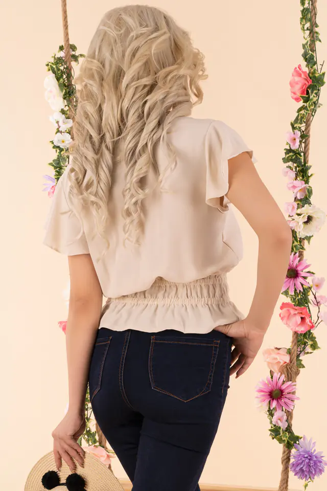 Zwiewna bluzeczka z krótkim - motylkowym ręwawem. Z przodu guziczki obciągnięte tkaniną jak bluzka. W talii marszczenie z wiązaniem.