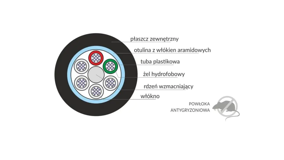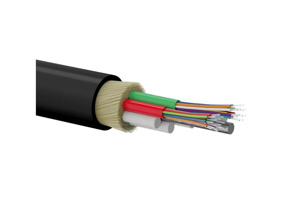 The center of the cable is the central strength element in the form of a plastic core surrounded by loose tubes in which there are optical fibers. The inside of the tubes is filled with gel or hydrophobic non-woven fabric, which is a moisture insulation. The whole resort remains surrounded and protected with plastic and aramid fibers, which are a safe anti-rodent barrier. The green tube is a directional tube.