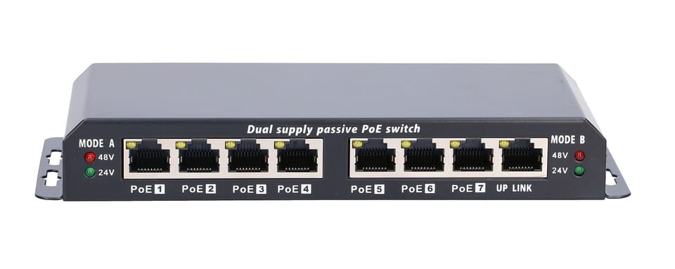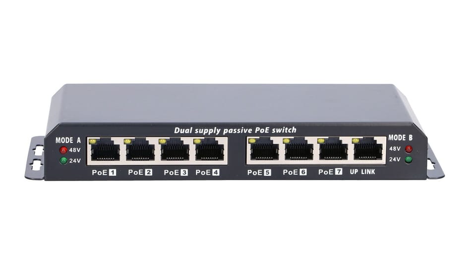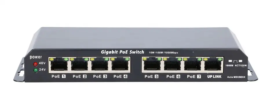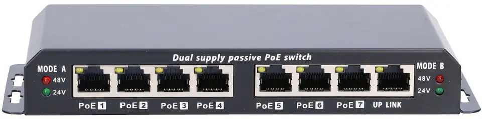 is a switch combining high performance, 8 10/100 Mbps ports including 7 PoE ports. PoE switch uses an external power supply from 18V to 57V. The device is designed for use in the home and small business. It is a cost-effective solution for environments where the power supply is not available or too expensive to install