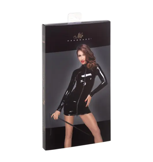 The tempting PVC mini dress has a black two-way zipper on the front. On the sleeves there are short black zippers that will awaken your party look.