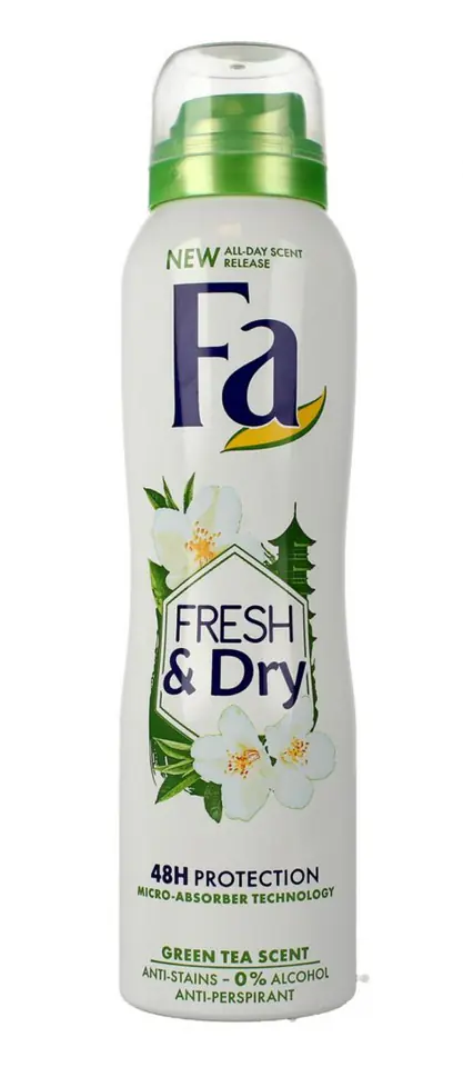 Discover fa fresh & dry antiperspirant with Non-stop Fresh technology with the smell of green tea. The skin-friendly anti-stain formula, with Fresh Release technology, provides 48h, effective protection and continuous release of freshness.