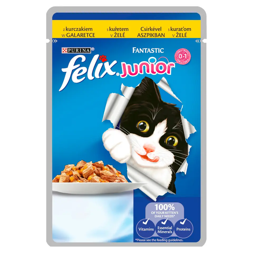 Felix Junior is a complete meal, which means that it does not have to be combined with any other food. Just put the feed out of the sachet and that's it. Serve according to the rules of feeding regardless of the flavors you have chosen.