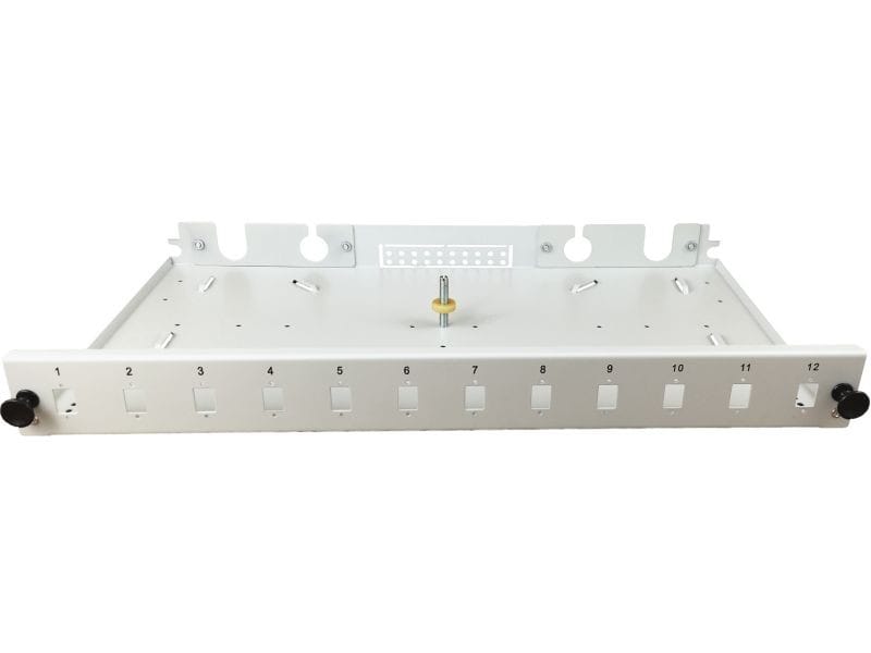 Fiber optic panel with pull-out tray for mounting in 19" racks and racks, 12 SC simplex ports or 12 LC duplex ports, gray.