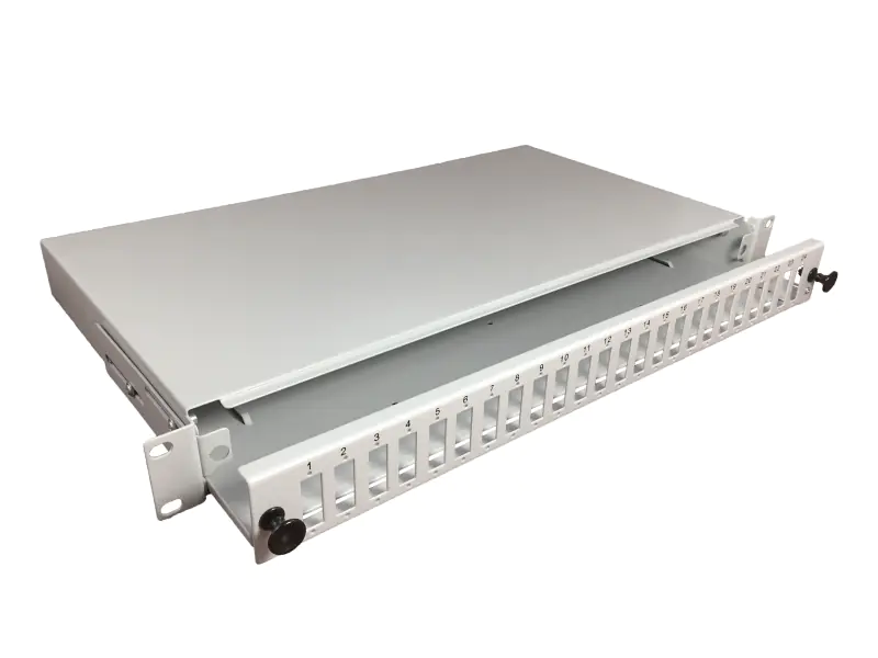 Fiber optic panel with retractable tray for mounting in 19" racks and racks, 24 ports SC duplex, gray.